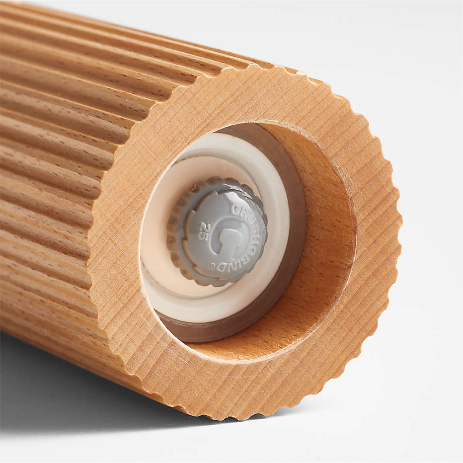 Natural beechwood shapes sculptural salt and pepper mills that evoke ancient Greek columns by way of modern Scandinavian design. Fluted on its upper half and smooth below, the pepper mill differentiates itself from the coordinating salt grinder in a satisfyingly tactile way. The adjustable porcelain mechanisms crush salt chunks and peppercorns as they grind to fully release flavors and aromas. As the debossed logos attest, our Handmade fluted pepper and salt grinders are Utenzo exclusives.