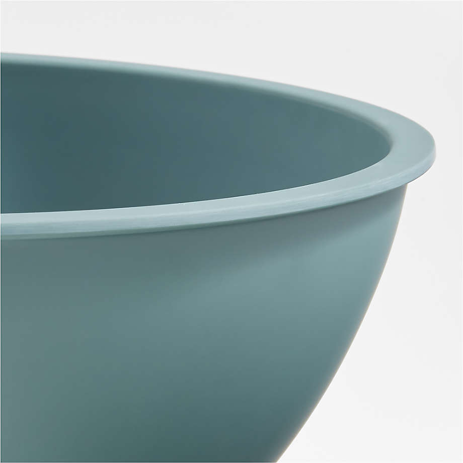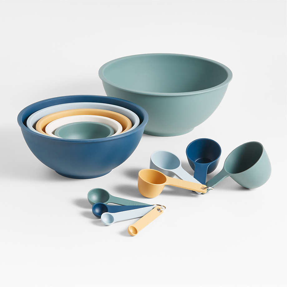 Six bowls in a sunny modern hues nest together, offering beauty, utility and versatility. Present a selection of snacks or salads and sides in the set of bowls, or use them for a variety of baking tasks. Crafted partly of bamboo fiber and melamine in teal green, ocean blue, powder blue, mustard yellow, cream and grey, our colorful bowls are durable and dishwasher-safe. A Crate & Barrel exclusive, this multicolor set makes a unique and useful housewarming, graduation or wedding gift.